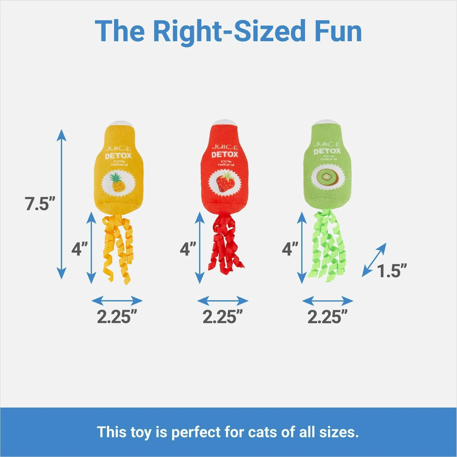 - Juice cleanse plush cat toys include catnip and crinkle paper to amp up playtime and get kitty moving.
